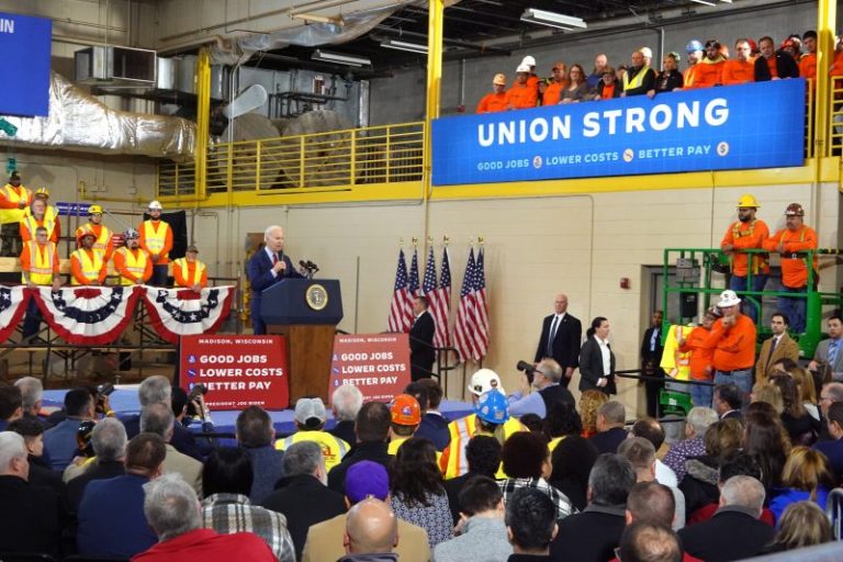 He left Washington on Wednesday to continue advocating for his administration’s efforts on the economy. He traveled to Wisconsin, where he spoke before members of the Laborers’ International Union. A banner on the wall read, “Union Strong.”