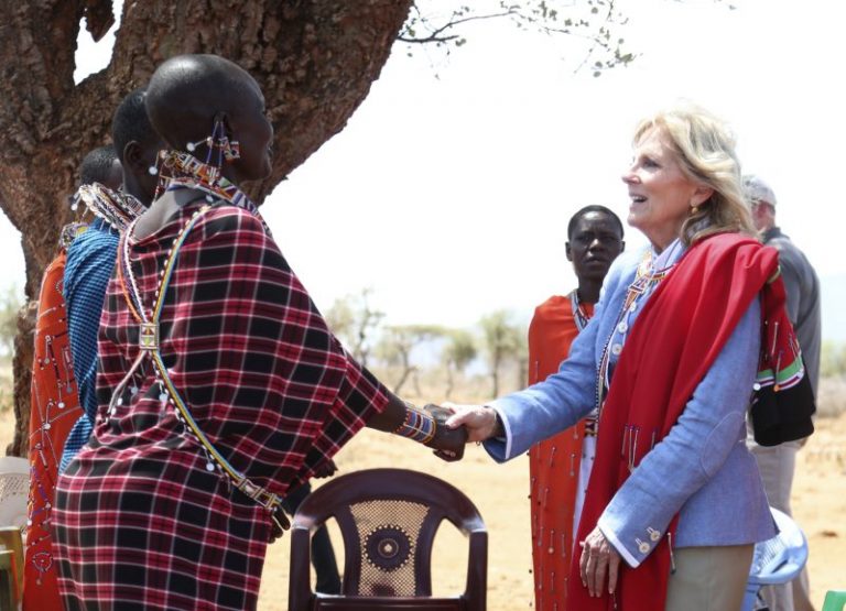 LOSITETI, Kenya — The wind picked up, and Jill Biden was suddenly enveloped in a cloud of red dirt, the kind that’s impossible to get out of your clothes, the kind that looks like rusty blood when it’s wet. That is, if it would ever rain here. The Horn of Africa, including Kenya, Somalia and Ethiopia, is experiencing its worst drought in recorded history, which is coming just six years after the previous worst drought on record. There are almost no crops, no grass, no brush in this village to hold earth to ground, just some bushes and one big acacia tree that somehow managed to survive. Which is why the 71-year-old first lady of the United States is here in this dust bowl swarming with biting black flies, gulping down bottled water after spending 90 minutes completely outdoors in the blazing African heat. She had devoted at least half of the visit to a listening session with Maasai women, who told her about how much their tribal herding lives had changed now that roughly 45 percent of the cows in Kajiado County have died.