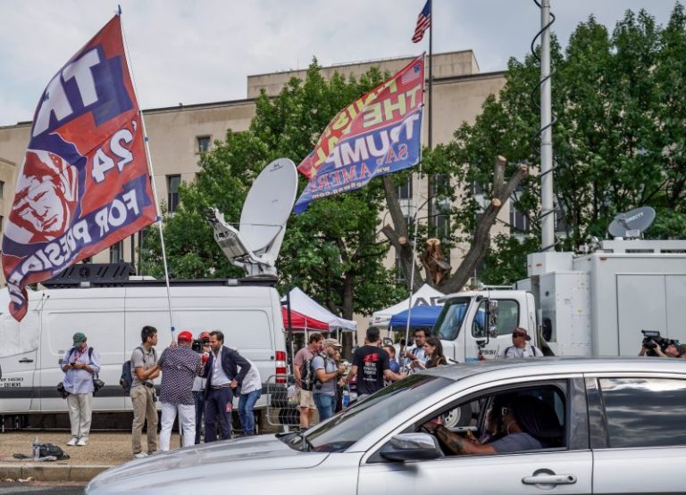 They blared bullhorns and hurled insults across Constitution Avenue. One group held signs that spelled out “JUSTICE.” Another group held posters that read “Blacks for Trump.” A person dressed in a blowup costume of Trump strolled across a field just west of the courthouse, screaming, “I don’t want to go to jail. Where’s my mom? Where’s Melania?”