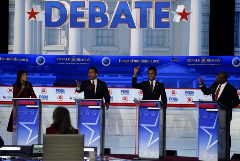 Fox Business Network debate moderator Dana Perino said to the candidates, who were presented with notepads and markers, “It’s now obvious that if you all stay in the race, former president Donald Trump wins the nomination. None of you have indicated that you’re dropping out. So which one of you onstage tonight should be voted off the island?”
