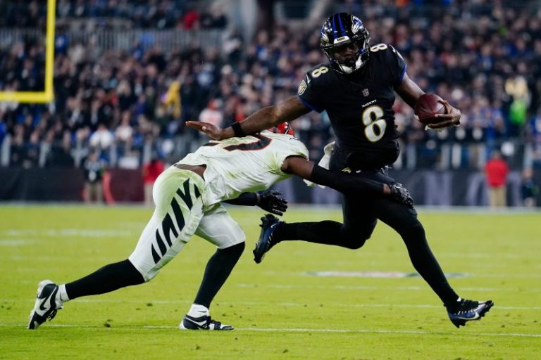 At the three-minute mark of the first quarter and Baltimore leading 7-3, Jackson rolled right toward the Ravens’ sideline and managed to get rid of the ball as he was tackled by Bengals linebacker Logan Wilson. The 2019 league MVP immediately grabbed for his leg, as the black-clad Ravens formed a cautious circle around him in front of their bench.