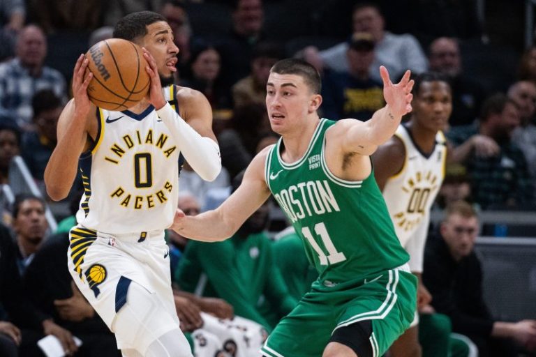 INDIANAPOLIS — Indiana Pacers All-Star point guard Tyrese Haliburton had to be carried off the floor in Monday night’s game against the Celtics when he slipped while trying to drive the lane.