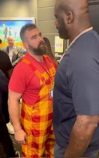 A few minutes after the first half ended, Shaq circled back. And as he stood outside the area in front of the entrance to the suite, Jason Kelce emerged.