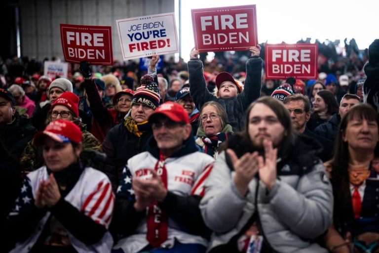 The campaign passed out signs that said “FIRE BIDEN,” and the crowd was shouting, “Joe can go to hell!” and “F— Joe Biden!” as Rep. Lisa C. McClain (R-Mich.) warmed up the crowd. At the mention of Whitmer, the crowd chanted, “Lock her up!” They danced and sang along to Pitbull and Johnny Cash, as much to stay warm as to have fun.