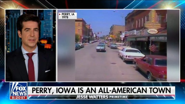 His report, with a news chyron declaring “Perry, Iowa is an all-American town,” was accompanied by clips from a 1978 video, found on YouTube, that pitched Perry as a good place for business investment. Interviews with three people — all speaking in unaccented English — were shown. “It’s a relatively small town with strong values and a very close-knit community,” one person said.