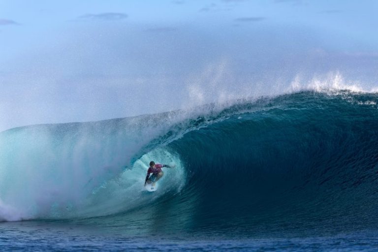 Johanne Defray of France needed four stiches for a head wound Saturday, underscoring the danger of surfing at the famous Teahupo’o break in Tahiti. It’s not just the powerful wave. It’s the shallow, sharp coral reef.