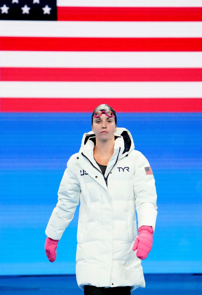 For two-time Olympian Kate Douglass, wearing the big parka is definitely to help prevent her muscles from getting chilled between warming up and competing.