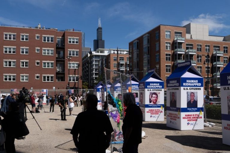 A few state and federal lawmakers came by, including Rep. Bradley Schneider (D-Ill.), who represents Chicago’s northern suburbs. Also stopping were the deputy U.S. ambassador to Israel and the Israeli consul general to the Midwest. They took in the other elements positioned on the lot, including a sculpture of a bloodied orange tree similar to the trees at an outdoor music festival that was overrun by Hamas militants during their deadly assault.