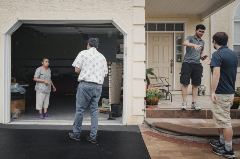 Armed with a friendly smile, he approached a gray home with a pile of sandals chucked outside the entrance. A woman cracked open the door, cellphone still in hand, and headed Patel off: “I’m busy.” She moved to shut the door.