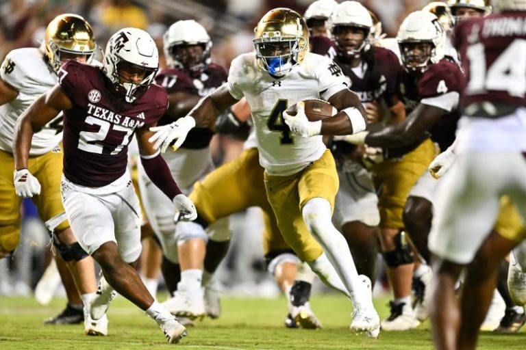 Notre Dame climbs two spots to No. 5 after winning 23-13 at Texas A&M. The Fighting Irish replace Oregon, down two spots to No. 6 after struggling to beat Idaho. USC is up 14 to No. 9 after beating LSU 27-20 in Las Vegas, while the Tigers drop 10 to No. 16.