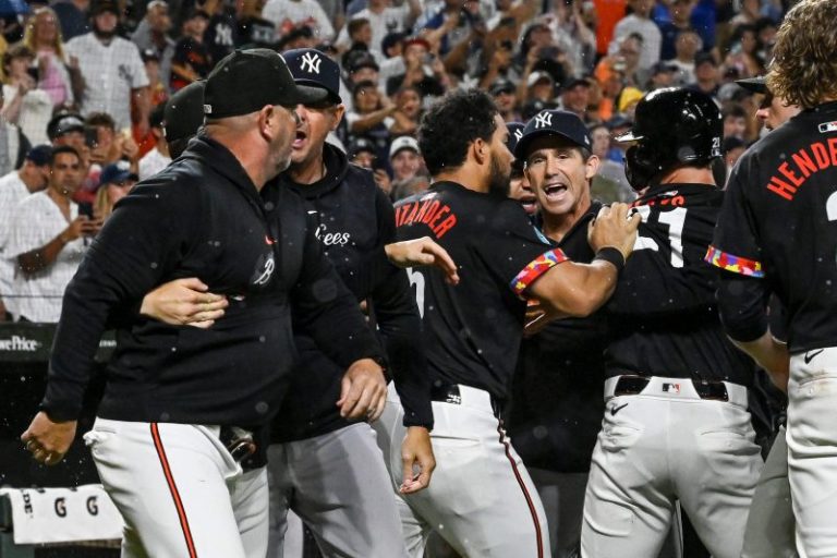 And then the rains came in time for the ninth inning, a steamy 81-degree night turned wet. Yankees closer Clay Holmes struck out Jordan Westburg for the inning’s first out, but when he tried to throw a front-door sinker to left-handed batting Heston Kjerstad, he badly yanked it.